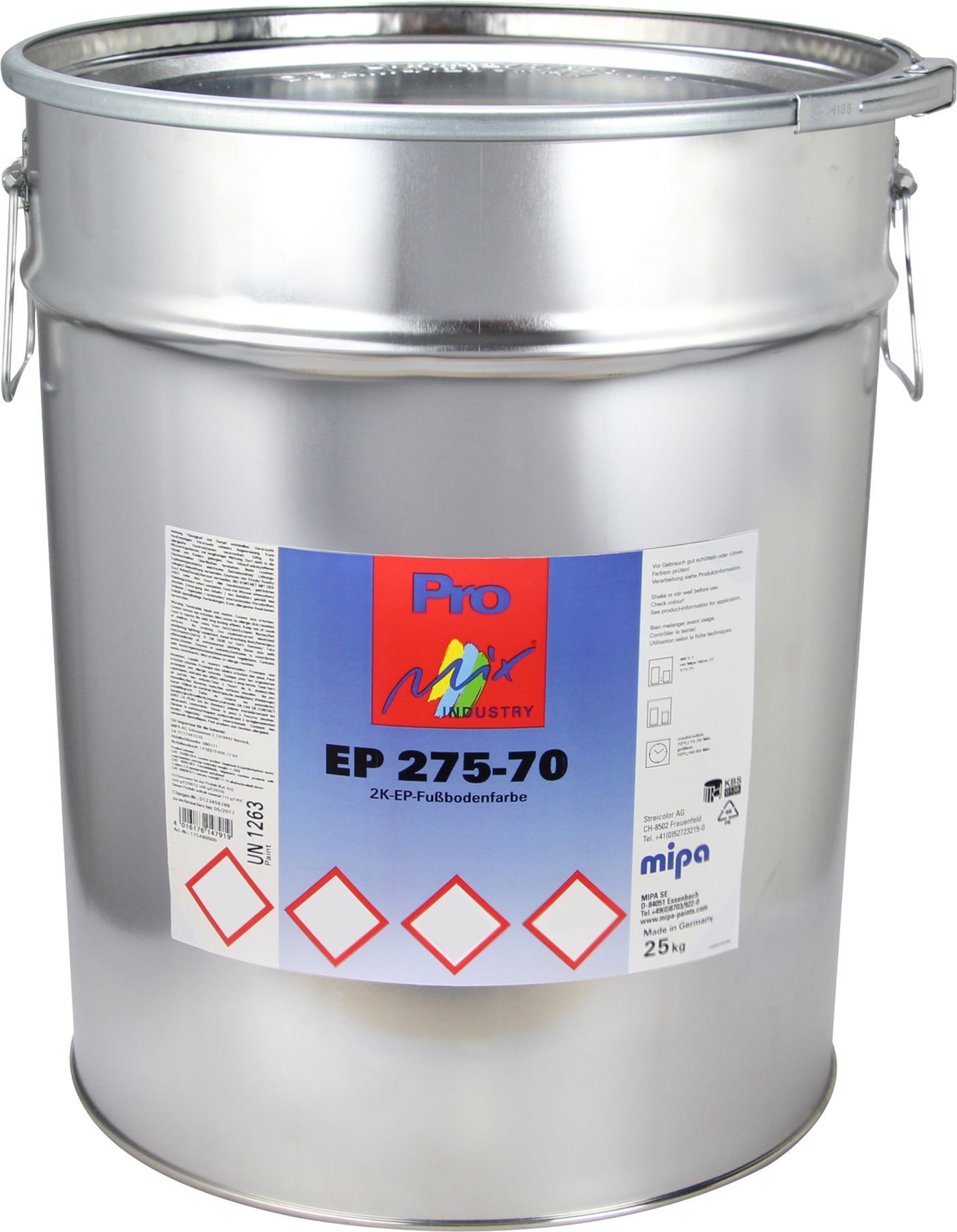 MIPA PMI EP275-70 2K epoksipohjainen lattiamaali. Liuotteeton itsestään siliävä 2K-epoksimaali mineraalipinnoille. Tuote on erityisesti suunniteltu korkeakiiltoiseksi ja hyvin tasoittuvaksi. Hyvä mekaaninen ja kemikaalien kesto. Kestää mm. polttoainetta, öljyä, tervaa. Vahvoja liuottimia ja happoja rajoitetusti. Levitetään siveltimellä tai telalla. Värisävy sävytettävissä PMI värijärjestelmässä. Kiiltoaste 70 eli kiiltävä. Käytetään yhdessä epoksikovetteen EP975-25 kanssa. Sekoitussuhde 5:1 painosuhteessa. HUOM! Käytä pohjustukseen ennen pintamaalausta Mipa EP150-70.